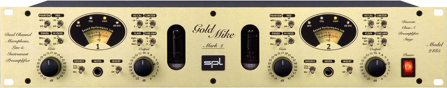 Der SPL Goldmike MK2 ist ein zweikanaliger Mikrofon- und Instrumentenvorverstärker, der Class-A-Transistorverstärkung mit Röhrentechnik kombiniert. Er bietet eine diskrete Transistorvorstufe und eine Röhrenverstärkung mit drei schaltbaren Ansteuerungen.