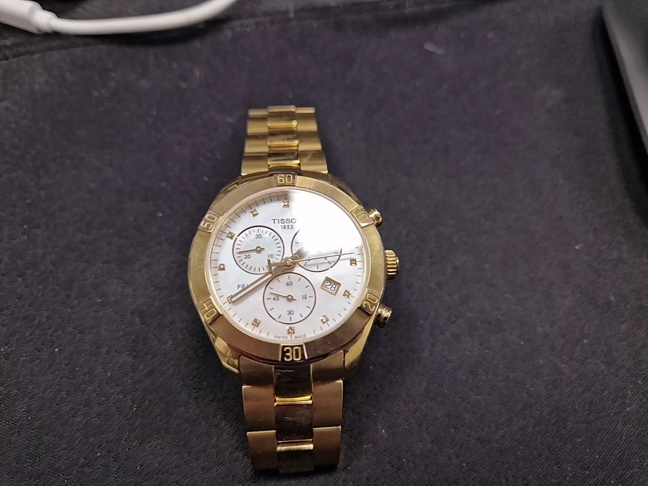 Tissot PR 100 Chronograph Gold, Damenuhr mit goldfarbenem Gehäuse, weißem Perlmutt-Zifferblatt und Chronographenfunktion. | Zustand: Gut