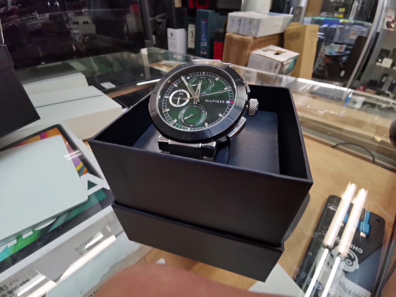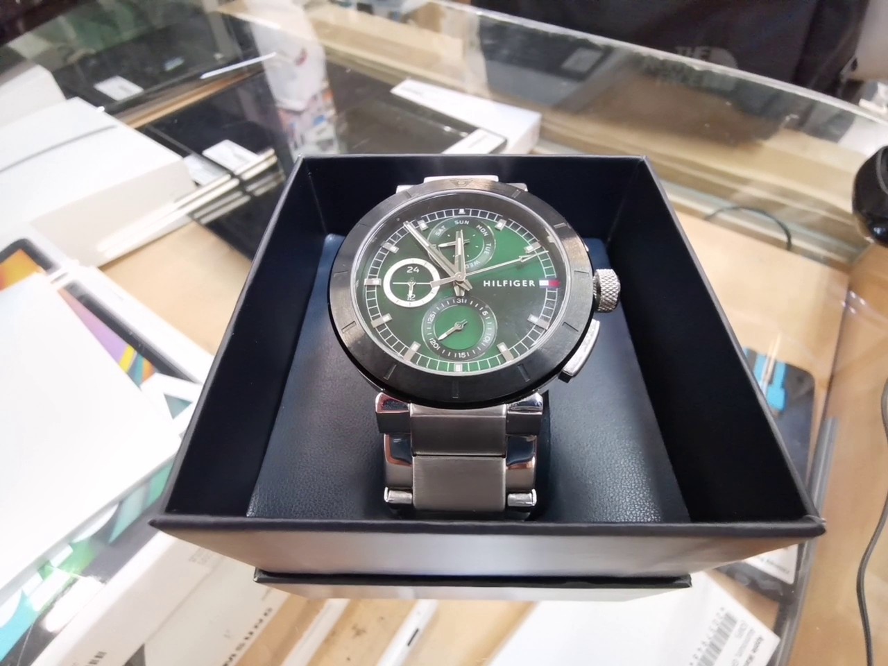 Elegante Tommy Hilfiger Herren-Chronograph mit markantem grünem Zifferblatt und robustem Edelstahlarmband in Silber. Diese Quarzuhr kombiniert sportliche Funktionalität mit klassischem Design und ist neu und originalverpackt.