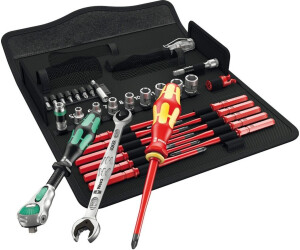 Umfangreiches Wera Kraftform Werkzeugset VDE in einer robusten Rolltasche, konzipiert für sichere Elektroarbeiten. Das Set beinhaltet eine Auswahl an isolierten Schraubendrehern, eine Ratsche und einen Drehmomentschlüssel, alle VDE-geprüft für Arbeiten unter Spannung. Die Kraftform-Griffe sorgen für ergonomisches und ermüdungsfreies Arbeiten.