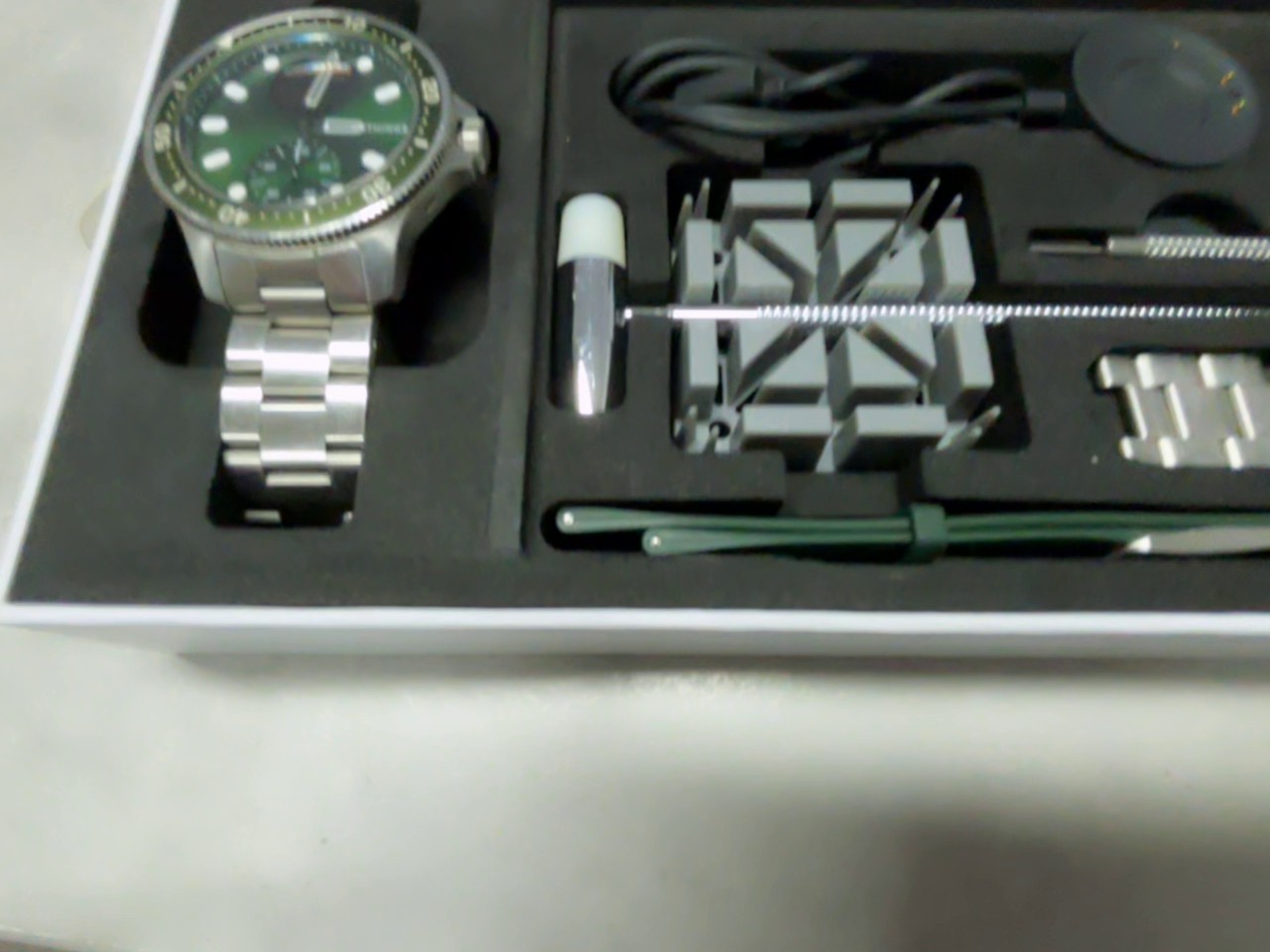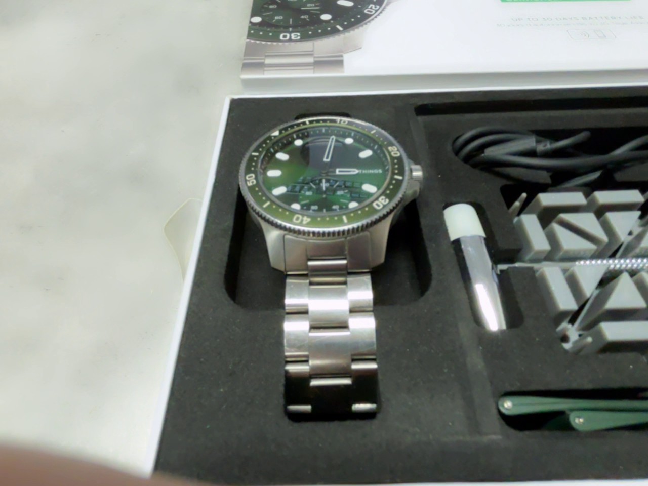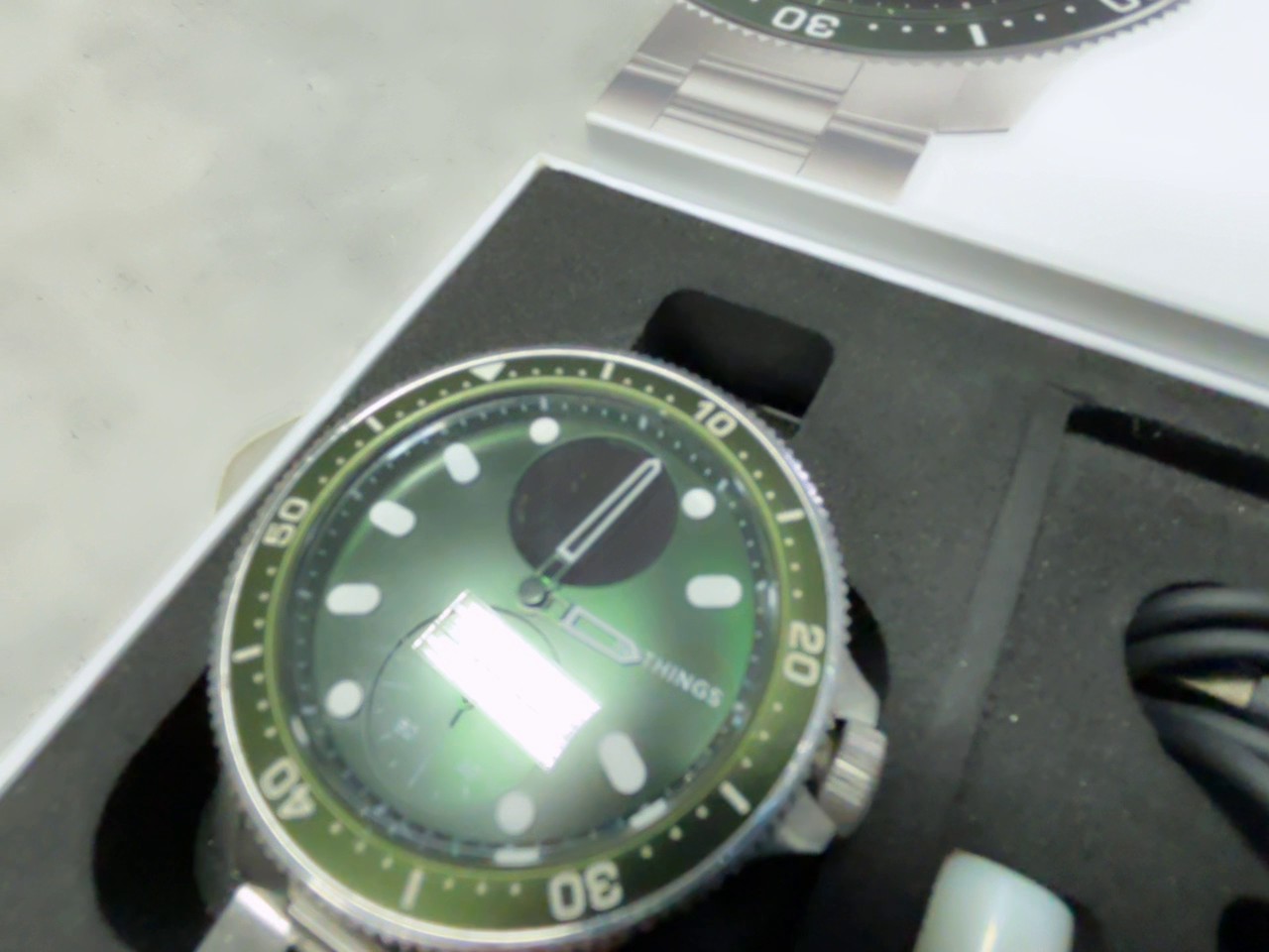 Hybrid-Smartwatch im Taucheruhren-Design mit grünem Zifferblatt und Edelstahlgehäuse, die klassische analoge Zeiger mit diskreten Gesundheits- und Fitness-Tracking-Funktionen kombiniert. Dieses gebrauchte Modell weist leichte Kratzer auf.